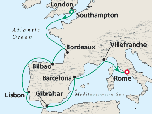 | Begin 13-day / 12-night Full Cruise: London to Rome - and - Begin 7-day / 6-night Option One: London to Lisbon |